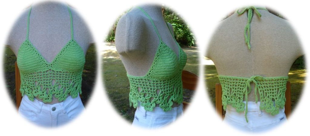 Celebrate summer with a Trellis Bouquet Halter Top crocheted in a cotton sports weight yarn. So perfect with jeans, shorts or a bikini bottom. Designed for a young adult woman, the bra is shaped to fit and is finished with a small decorative edging. A lacy trellis with a bouquet of blossoms covers the midriff.